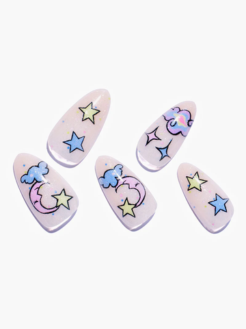 Colorful Night press-on nail style features a sparkling moon, stars, and clouds that add a soothing effect to your mood. The contrasting colors are eye-catching and the design taps into your playful side. This shiny press-on nail has tons of allure and is perfect for a date night under the stars. This nail style is so classy, transforming any look from drab to fab.