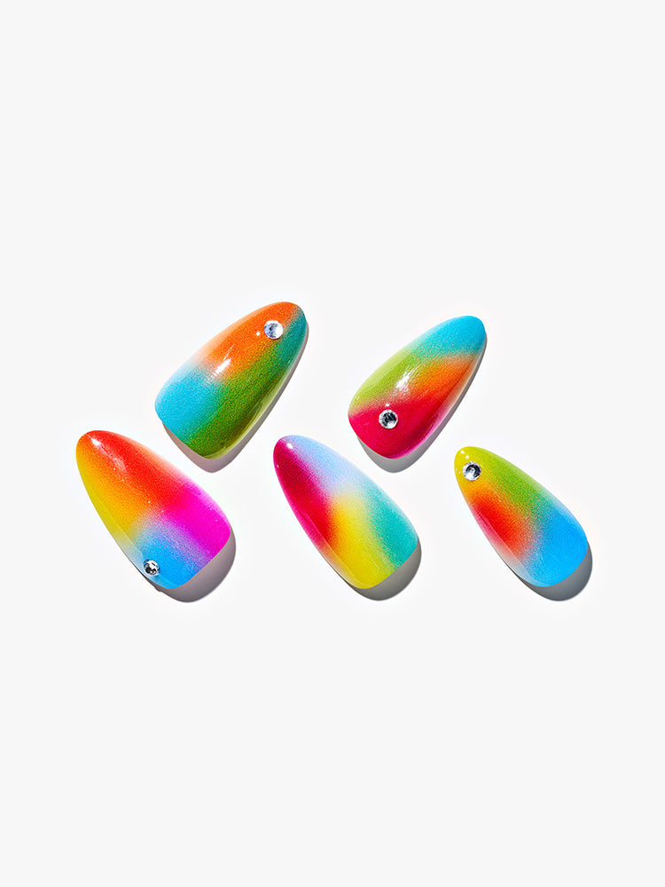 Experience a burst of color and enchantment with our exquisite press-on nail design: Palette. Crafted with meticulous attention to detail, the nails will add a touch of whimsical beauty to your manicure. Each nail features a vibrant rainbow gradient, beautifully blending hues of red, orange, yellow, green, blue, and purple. The rainbow design symbolizes joy, positivity, and inclusivity, making it the perfect choice for those who embrace diversity and celebrate individuality. To elevate the enchantment, we've adorned these nails with delicate little diamonds that shimmer and sparkle in the light, adding a touch of glamour and elegance to the overall look. The combination of rainbows and diamonds creates a captivating contrast, capturing the essence of both playfulness and sophistication.