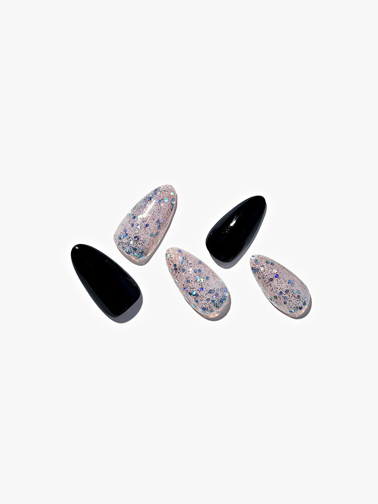 Are you ready to make a bold statement with your manicure? Look no further than our stunning nail design, "Jumping Cosmos". These press-on nails are a perfect blend of edgy and glamorous, combining shards of silver accents on a sleek black background. With the press on nails, you can instantly elevate your style and command attention wherever you go. Silver shards create a captivating visual effect, adding a touch of drama and sophistication to your nails. The contrasting black background adds depth and intensity, making this design truly stand out. Not only are these nails visually striking, but they also offer the convenience and ease of press-on application.