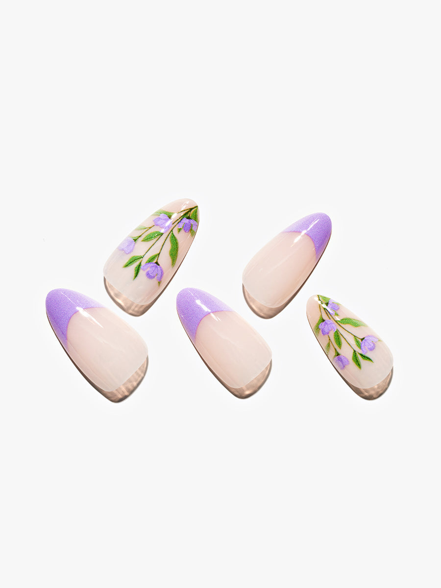 Indulge in the serene beauty of our Lavender Blossom press-on nails. Designed to captivate with their timeless charm, these nails effortlessly combine the delicate allure of lavender with the classic elegance of French tips. Each nail features a soft lavender base, reminiscent of blooming fields and soothing aromas. The color exudes a sense of tranquility and femininity, making it a perfect choice for any occasion. The subtle hue complements a wide range of outfits and adds a touch of sophistication to your overall look. Adding a touch of classic glamour, the French tips provide a clean and refined finish. And French tips also elongate the nails, giving your hands an elegant and polished appearance.