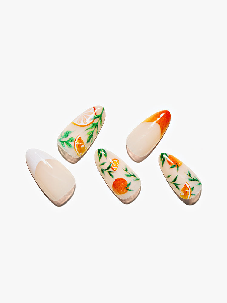 Tangerine Dream: Let your nails embody the essence of juicy tangerines with shades that range from light citrus to deep sunset hues. These press-on nails add a touch of playfulness and zest to your style, perfectly capturing the spirit of summer and happiness.