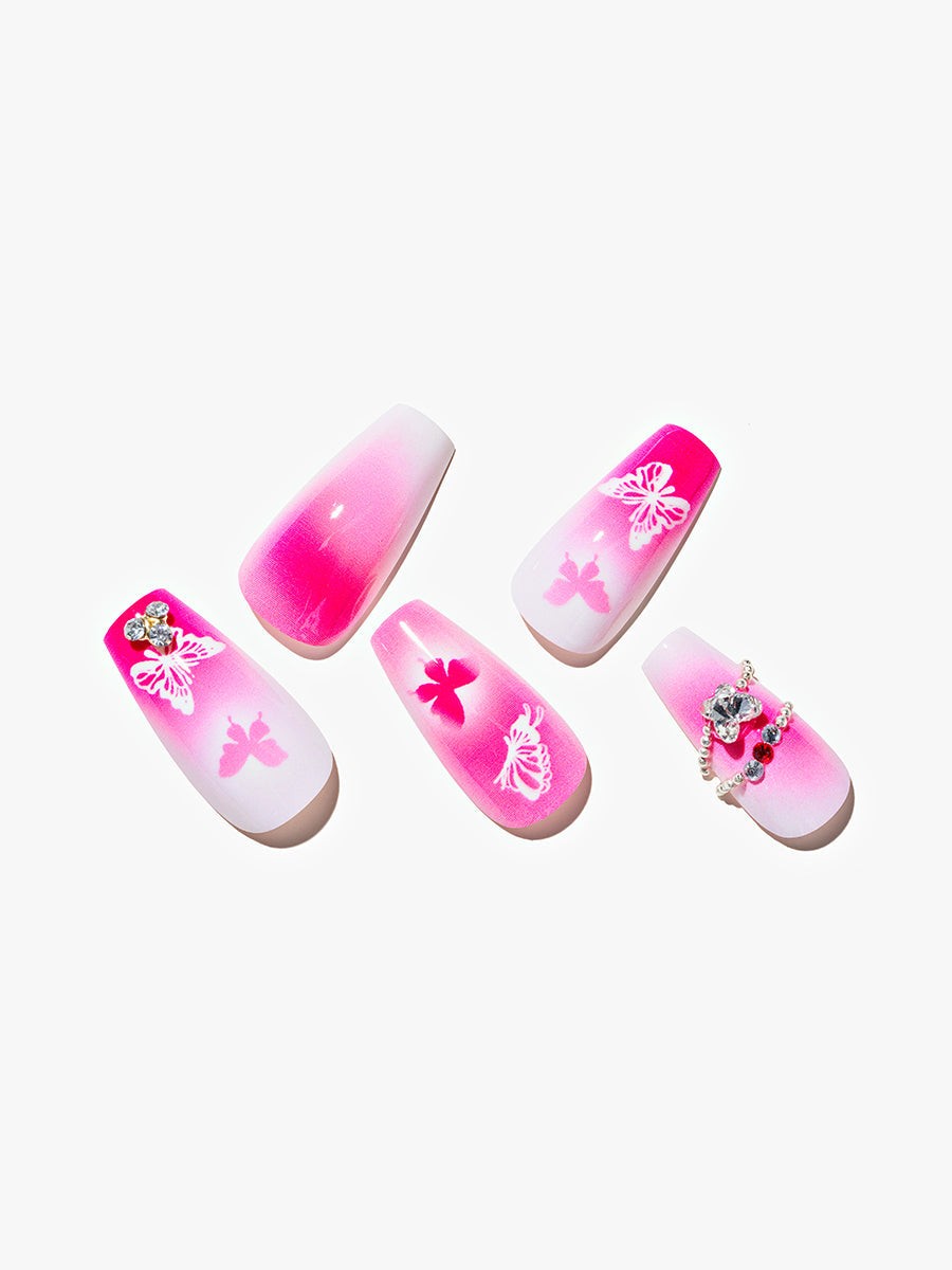 Experience the essence of transformation and beauty with the Butterfly Kiss nail art. Soft pink hues, delicate butterflies, and shimmering accents come together to create a whimsical and ethereal look. Just like Barbie's timeless charm, these nails capture the magic of metamorphosis, making them a delightful choice for those who love to embrace their inner free spirit.
