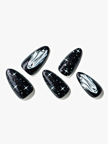 What’s a Halloween without a ghost costume? This time celebrate Halloween by wearing Night Soul press on nails. These press on nails have a ghost design and shiny stars with a black background, making them a perfect accessory for Halloween. Order yours now!