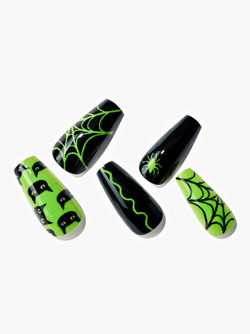 Looking for a cool yet funny press on nail design for Halloween that will match the Halloween theme too? If yes, then get your hands on this Spiderweb Cat nail design. These press on nails are designed with a black cat, spider web, and spider. The black and funky green color will surely catch everyone’s attention even at the party.