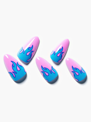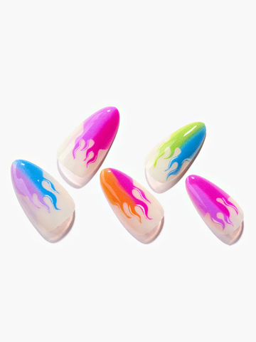 Stand out from the crowd in style with nails like these! Fire Element press-on nail design features neon flames! This press-on nail is in a stylish almond shape, and it starts as a nude, and the colorful flame designs are added to the nail tips. Each nail is different in a color that complements each other. On each hand, three nails have ombre flame art, and the other two have pink flames. You'll surely love the colors because the blue, purple, orange, and green look stunning together. This Glamermaid’s press-on nail is perfect for summer camping.