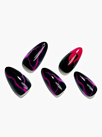 Black nails never go out of style. Kick-off with this uber-edgy press-on nail design, which features a black base color and a red accent flame nail painted overtop. It also shows a purple thunderbolt that helps the black flames pop, so feel free to choose this Divine Punishment press-on nail design for your next mani! Just one look at this press-on nail, and you’ll understand why: this flame nail design adds an edgy vibe to your entire look, and it really embodies punk-rock “cool girl” energy.