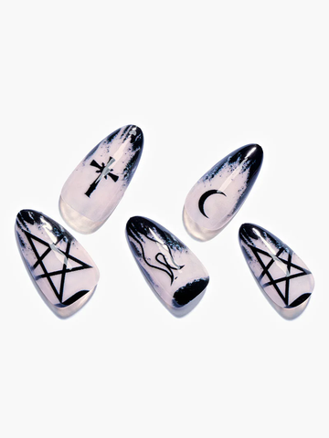 The goth aesthetic is about the unexpected combination of black with light, feminine colors. Use this Black Icon press-on nail design to channel the best of both worlds. This press-on nail has different prints on each nail. It has stars, a moon, a cross, and a flame. Each print has a black color enhancement on a white background.