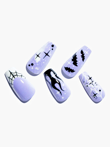 If you want something unique, consider Bat And Flame press-on nail design. In this design, each press-on nail features unique patterns that personify the bad girl image. On each hand, two nails have sparkle nail art, and the other remaining nails have bats, and spider web, flame on the nail tip. You'll surely love the black and white combination.