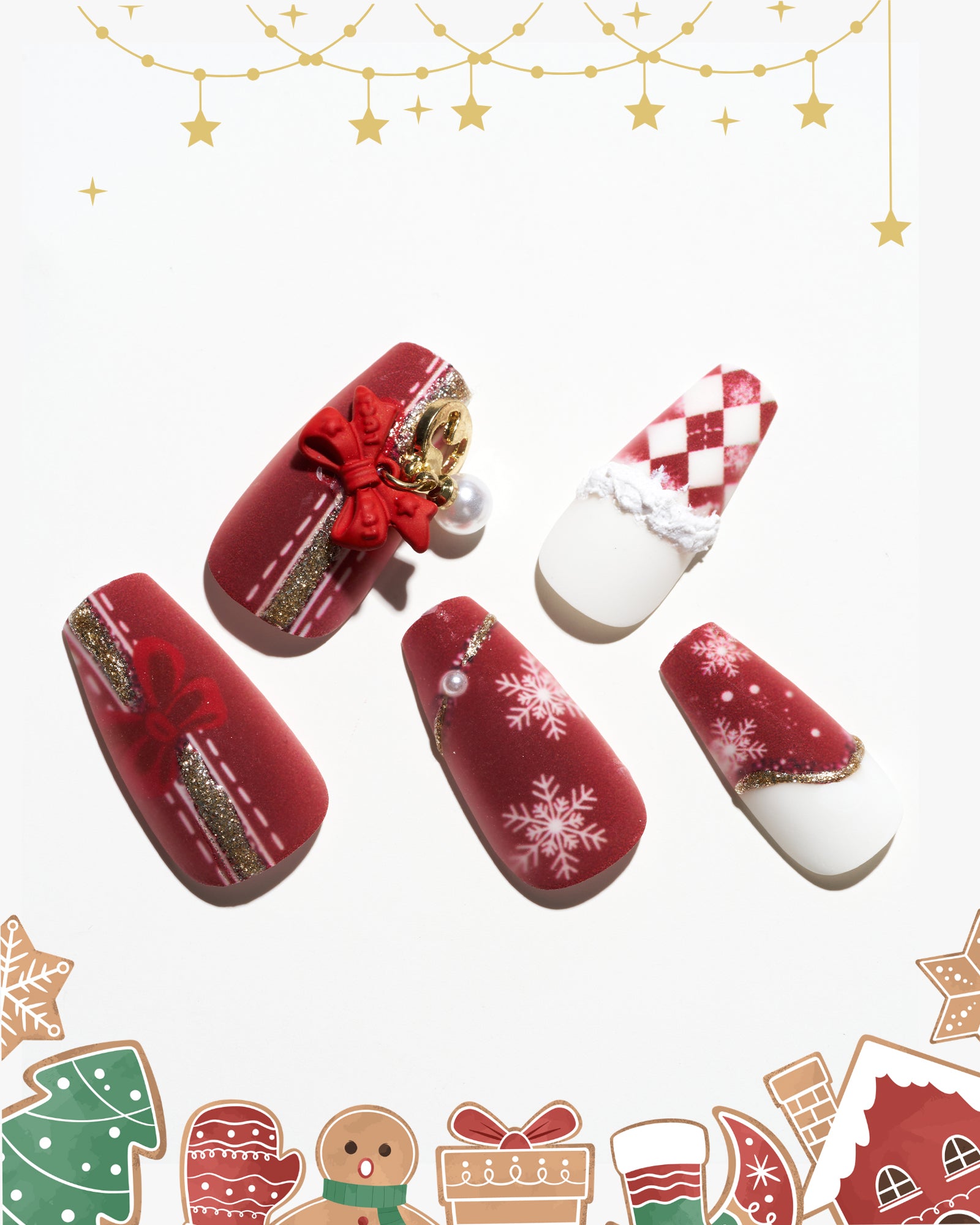 Snowflake Carpet (Handmade)|manicure|real nail gel|christmas|snowflake|pearl|red|white|matte|coffin|medium long|3D art|party – Glamermaid Glam