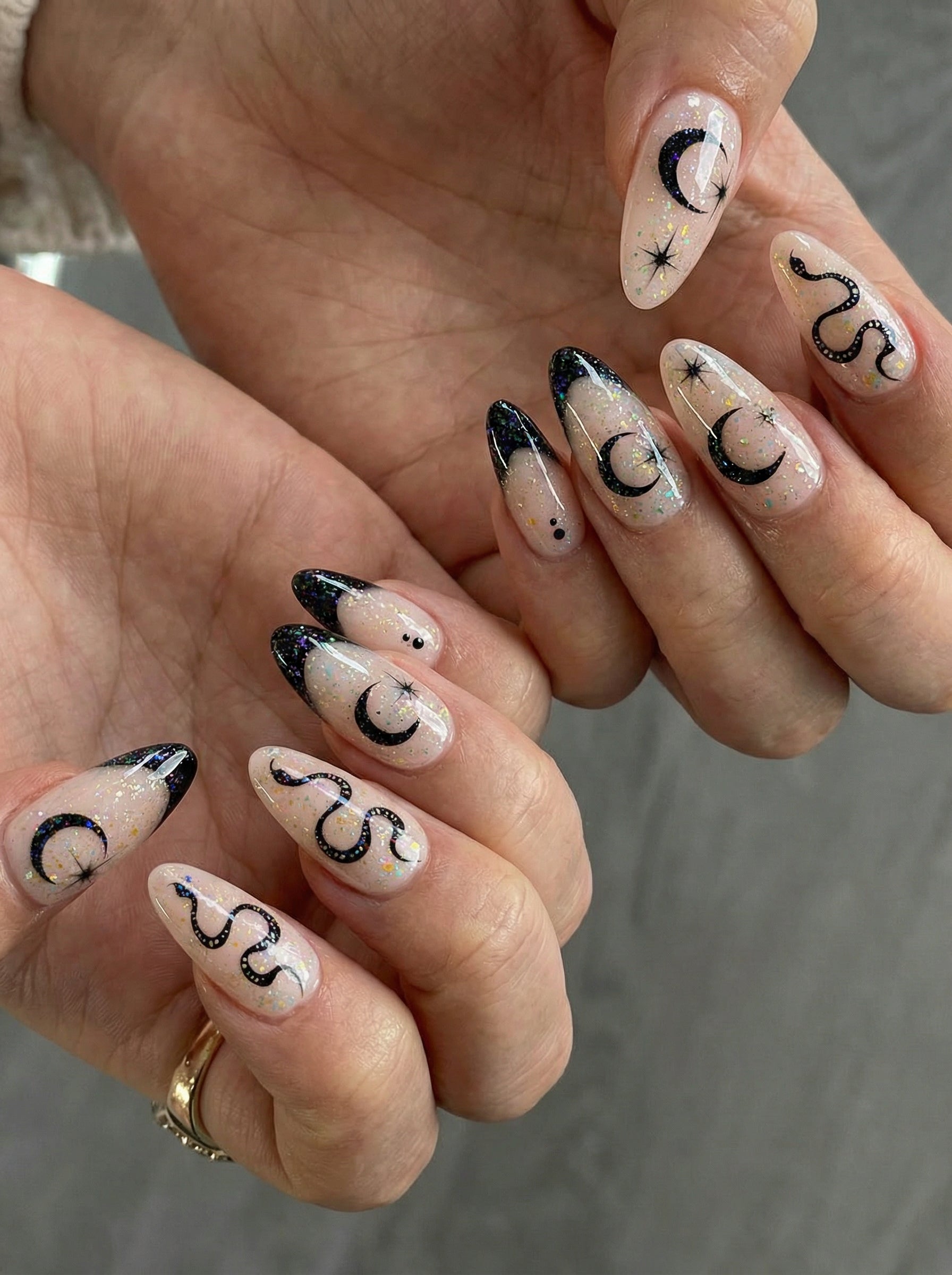 Moon & Snake|manicure |nude|black|glitter|almond|medium|tarot|daily – Glamermaid Glam
