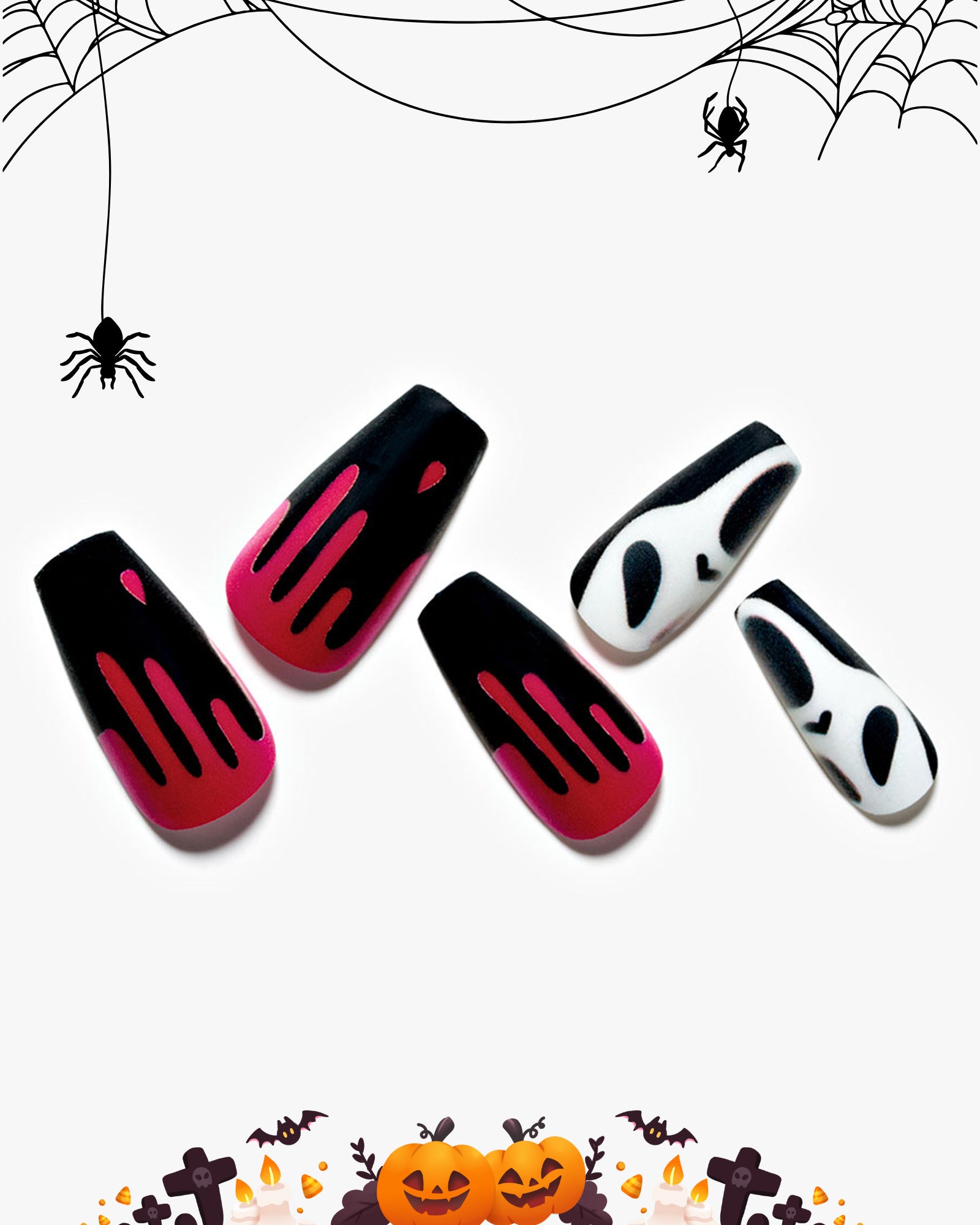 Medium length, Coffin shape,Black|Redcolor basic, Cartoonnailsdesign style,Mattefinish.