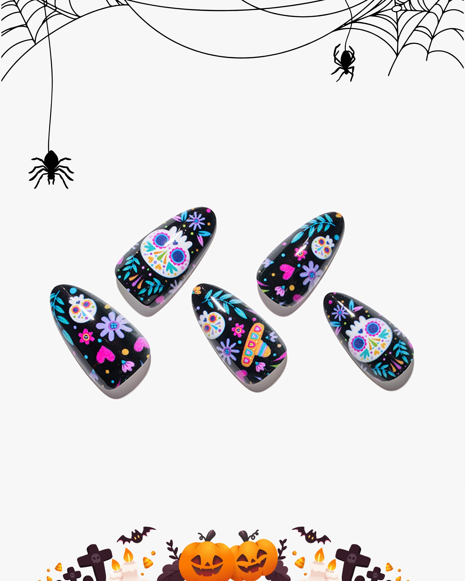 Spirit Garden|manicure|flower|heart|skull|halloween|leaf|colourful|black|glossy|almond|medium|nature|vacation – Glamermaid Glam