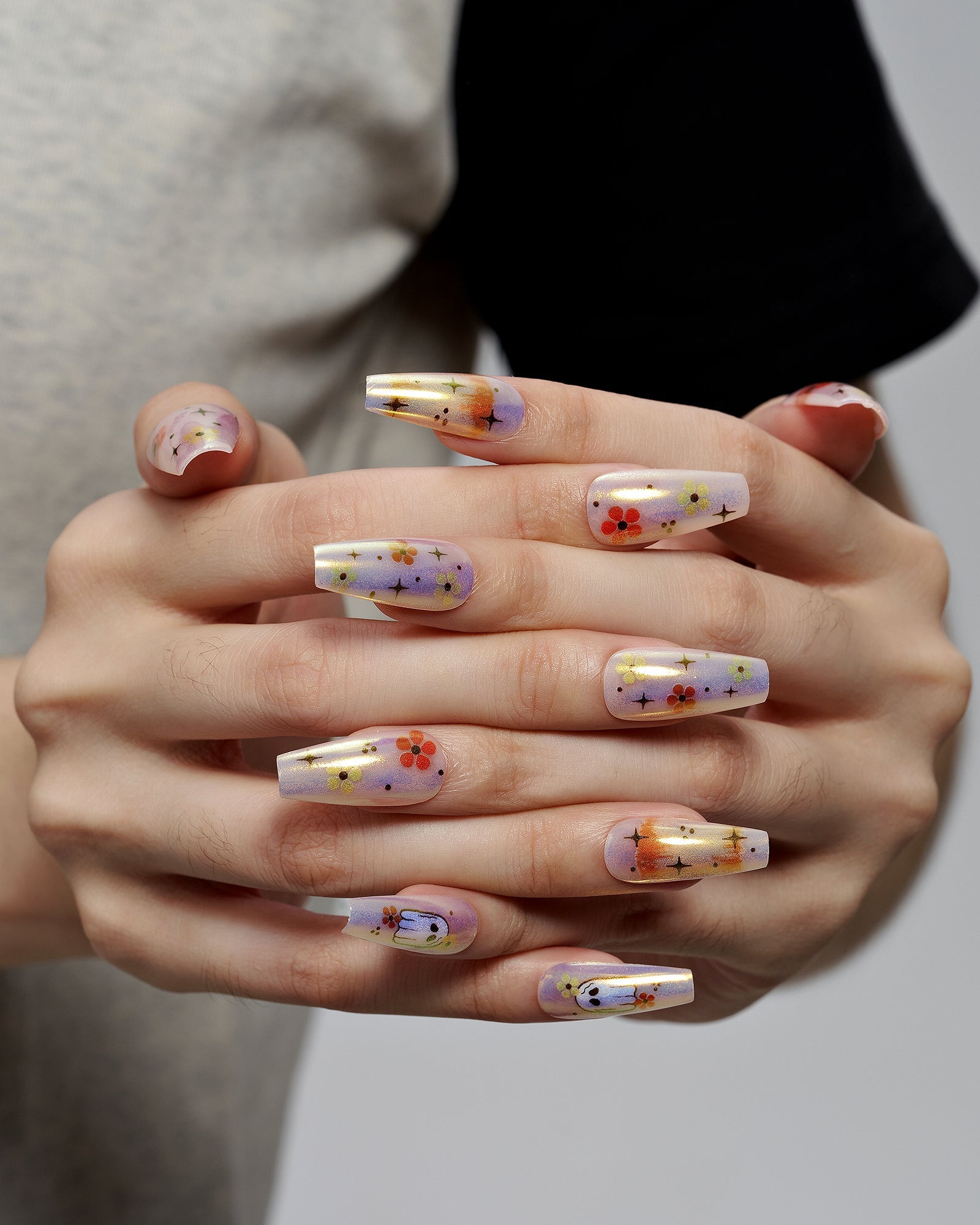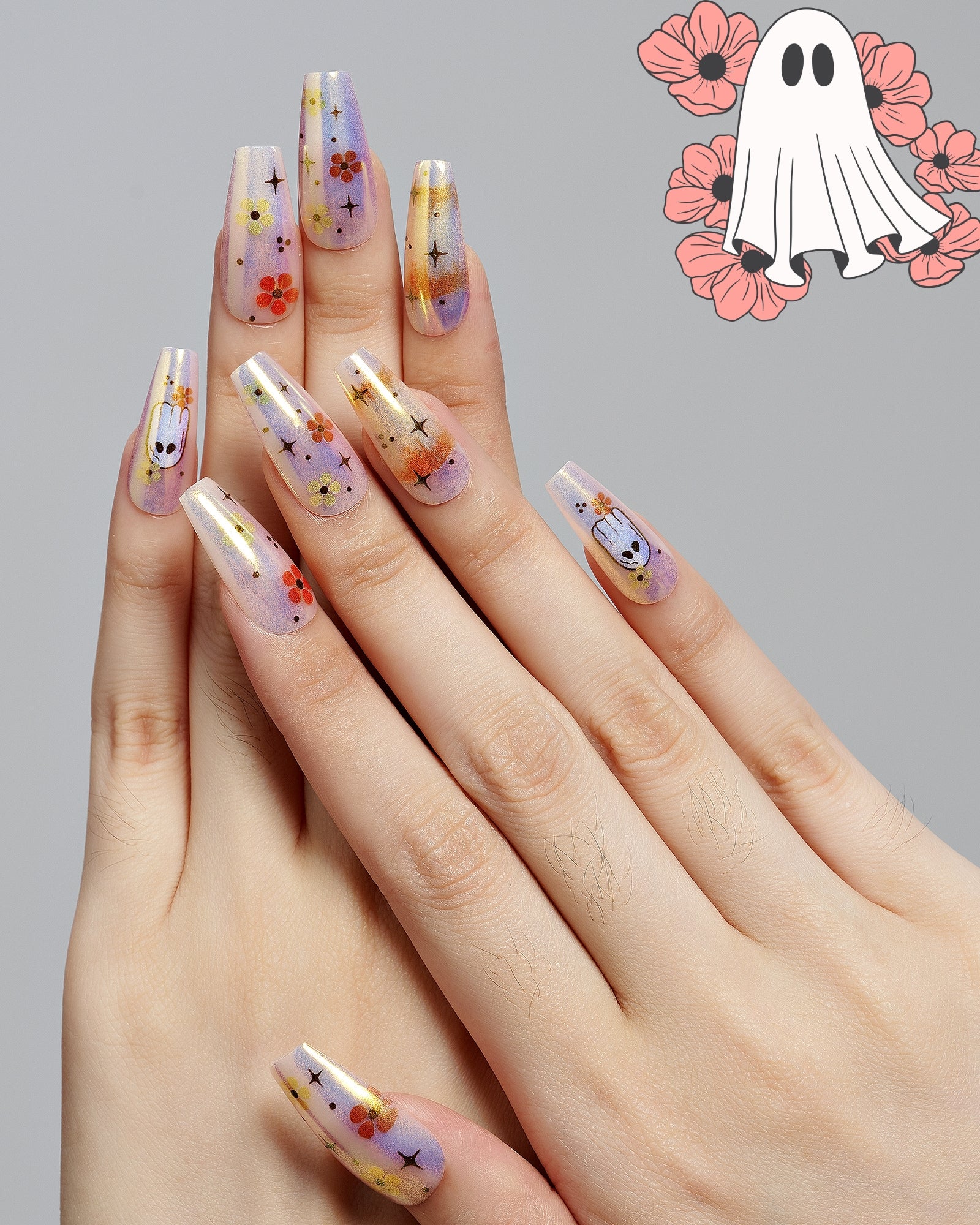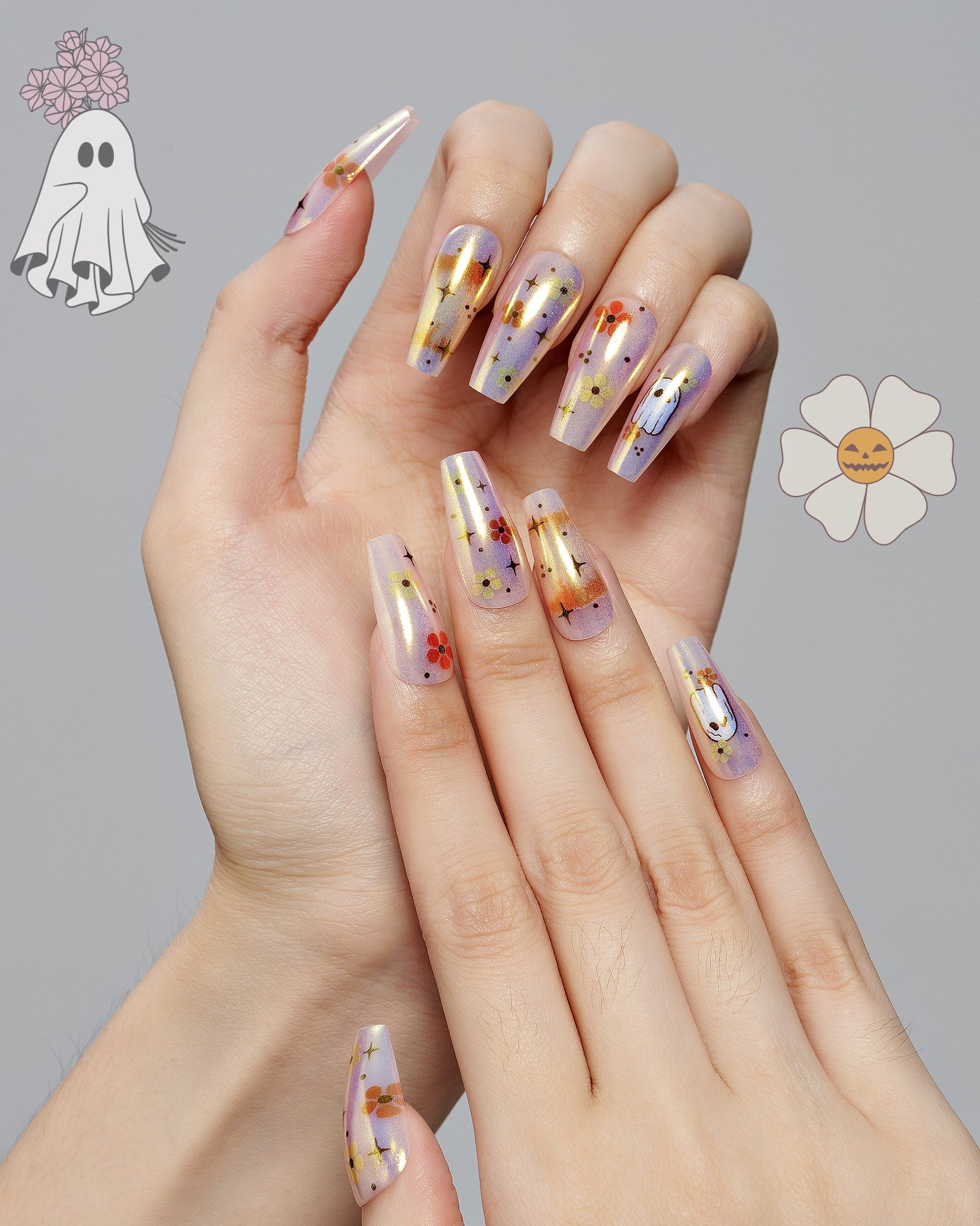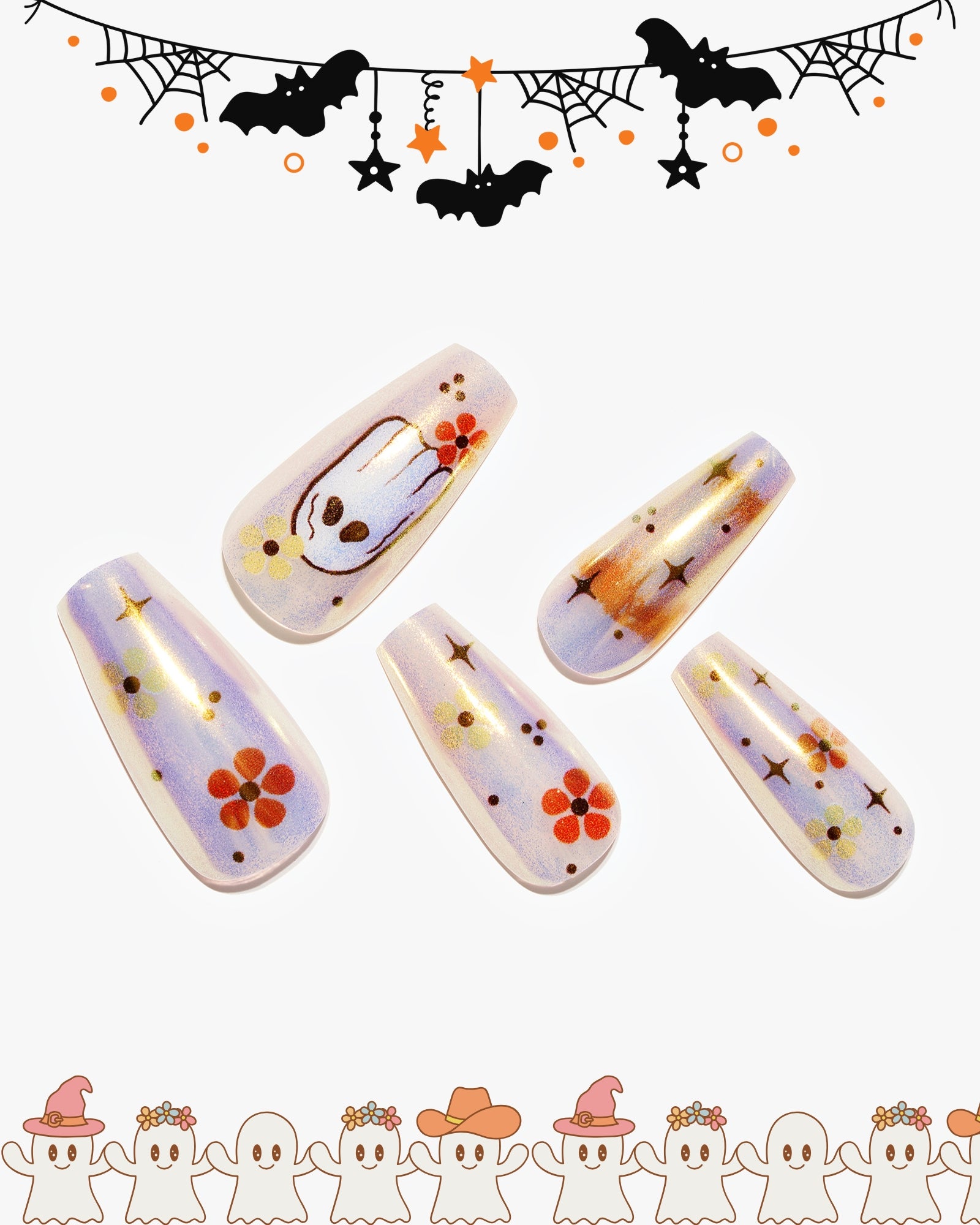Happy Haunt (Handmade)|manicure|ghost|real nail gel|halloween|flower|chrome nail|colorful|glossy|coffin|medium long|cartoon|party – Glamermaid Glam