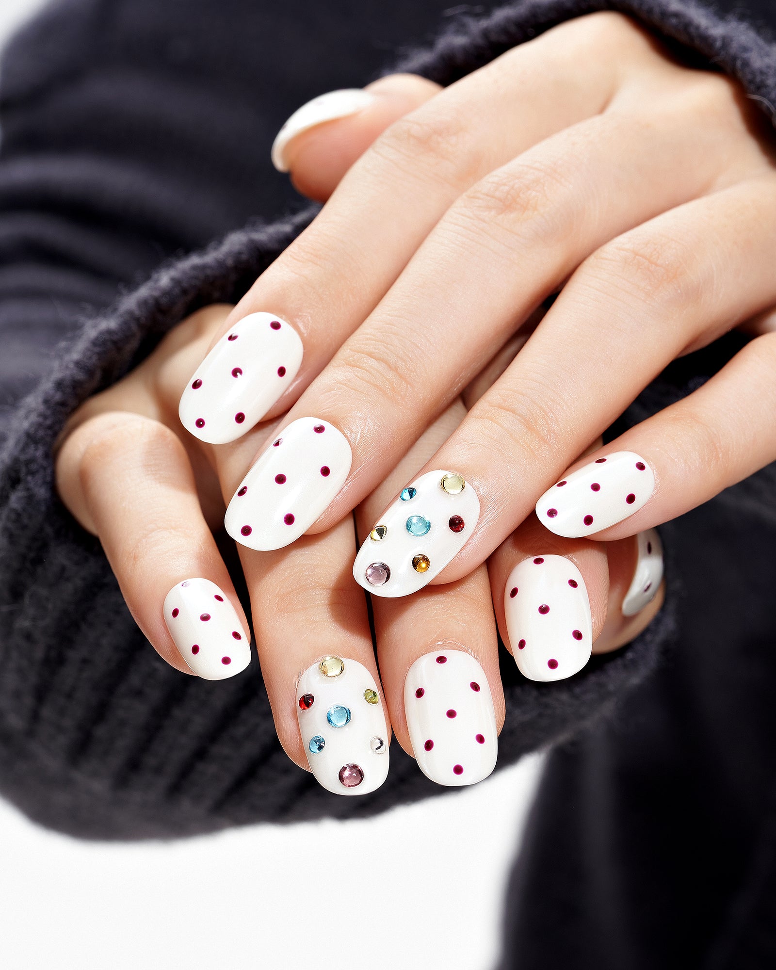 Berry Dots (Handmade)|manicure|real nail gel|mirror powder|christmas|white|red|glossy|round|medium|polka dot|work – Glamermaid Glam