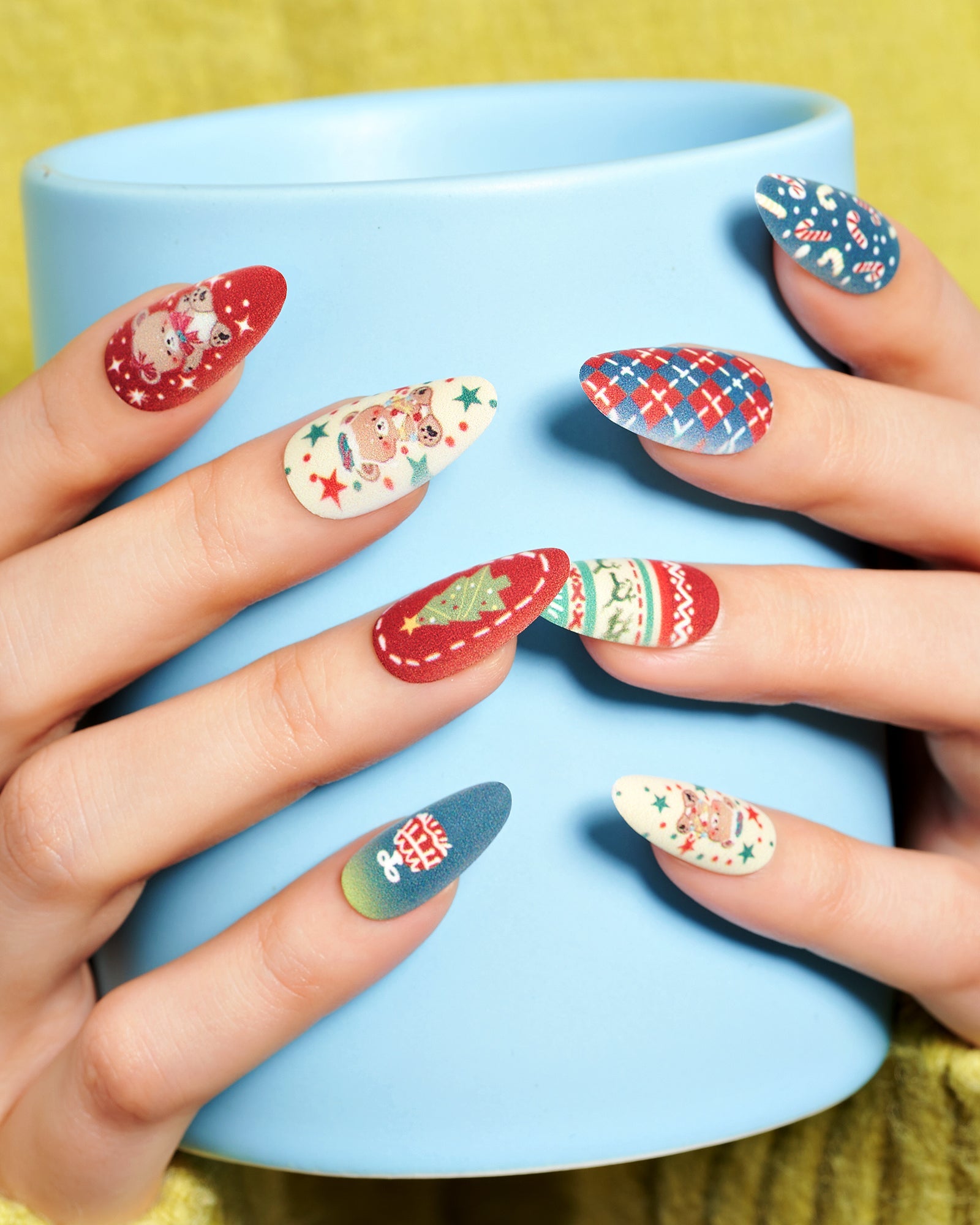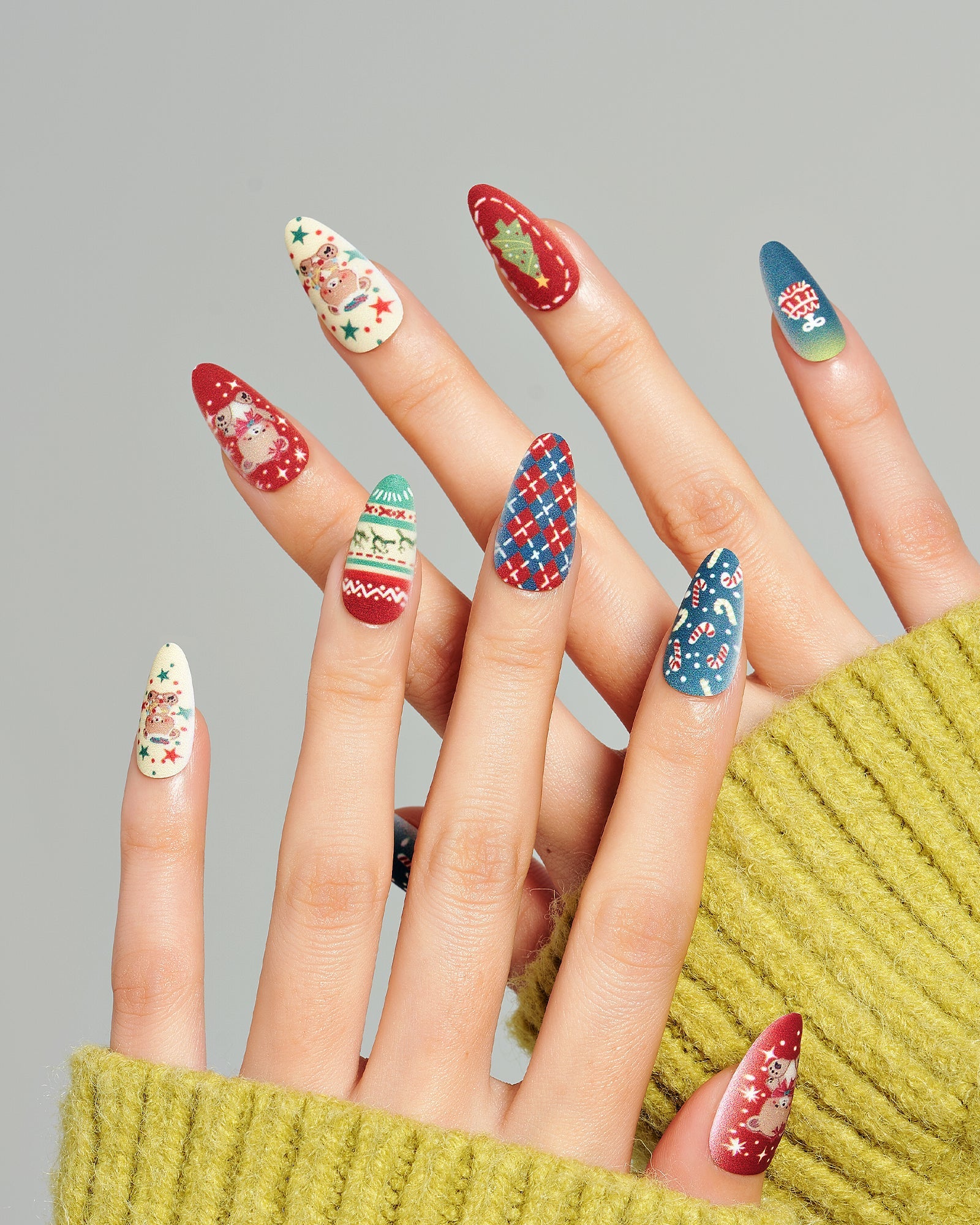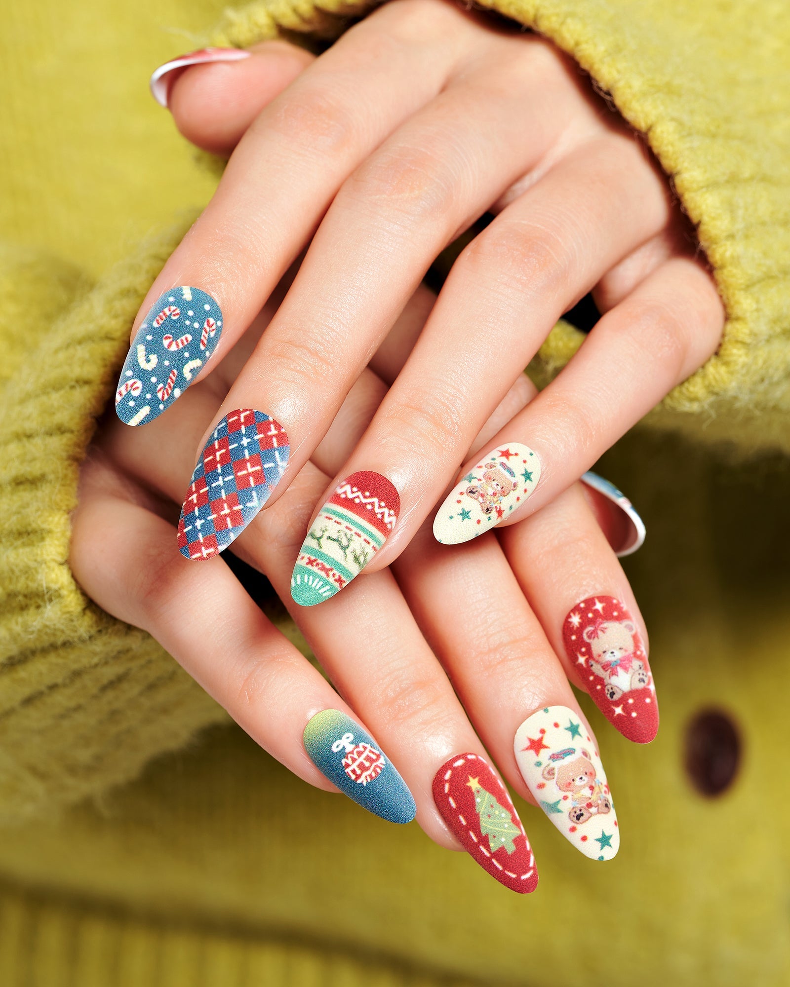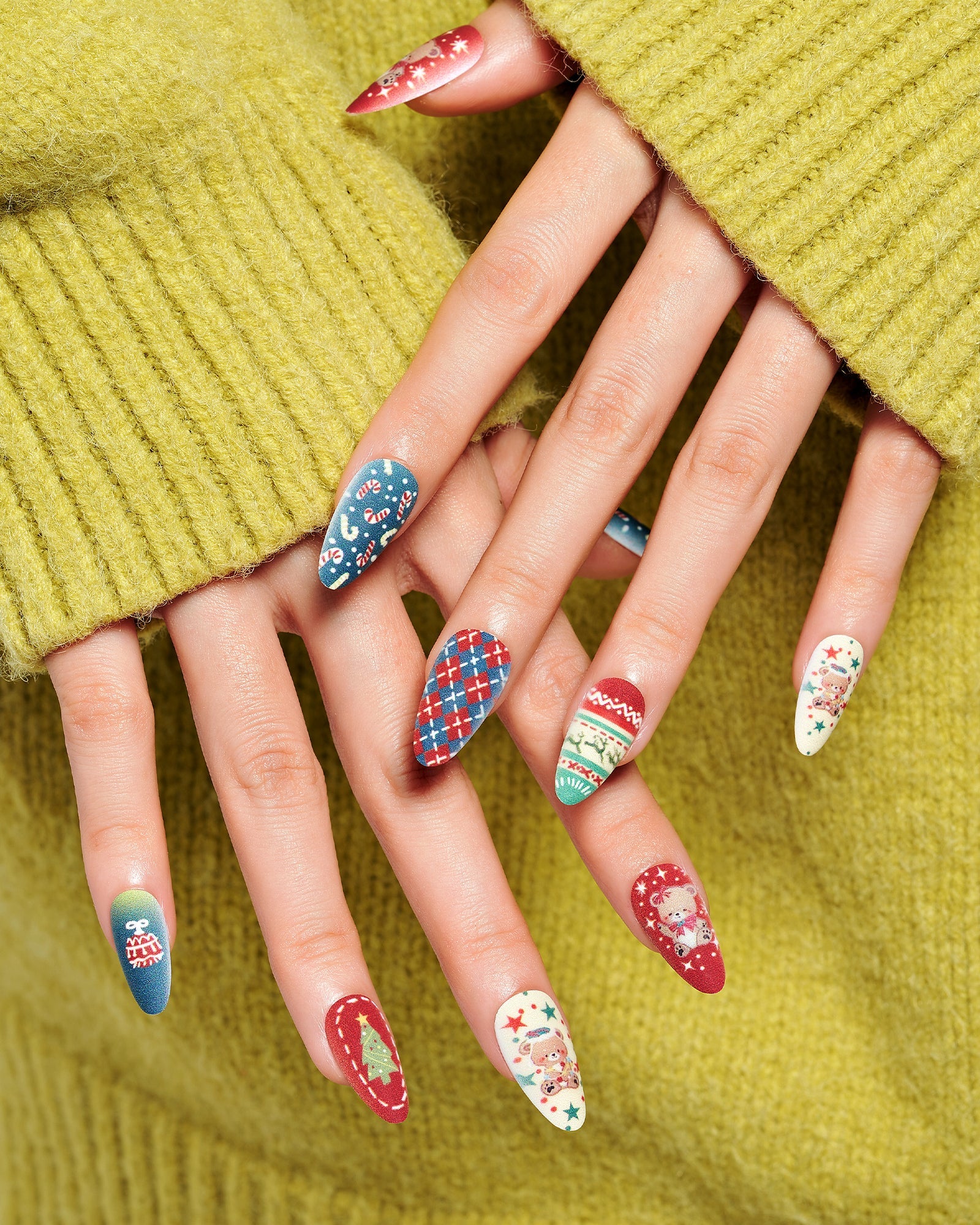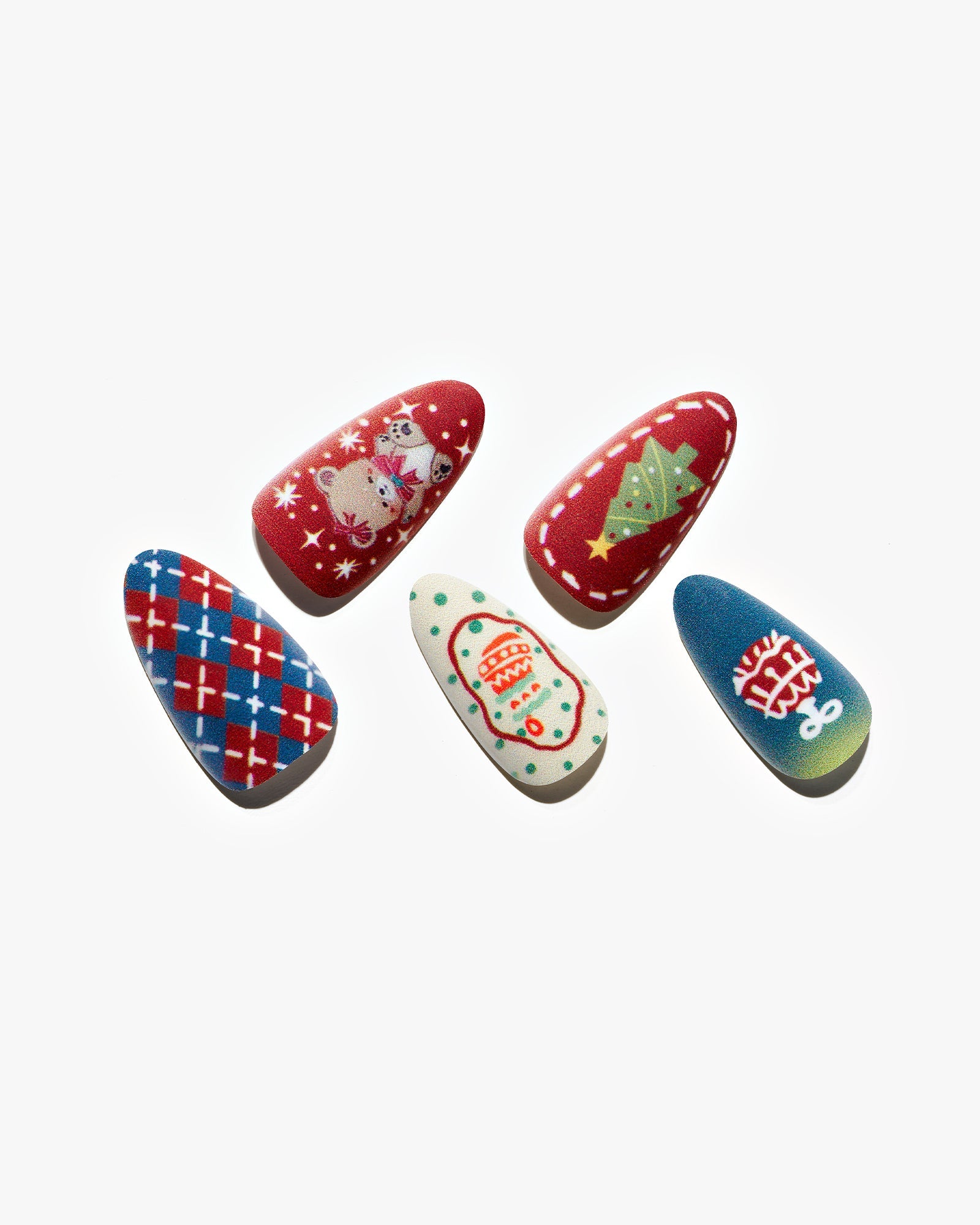 Bear Plaid|manicure|checkerboard|jump color|christmas|bear|tree|colorful|matte|almond|medium|cartoon|party – Glamermaid Glam