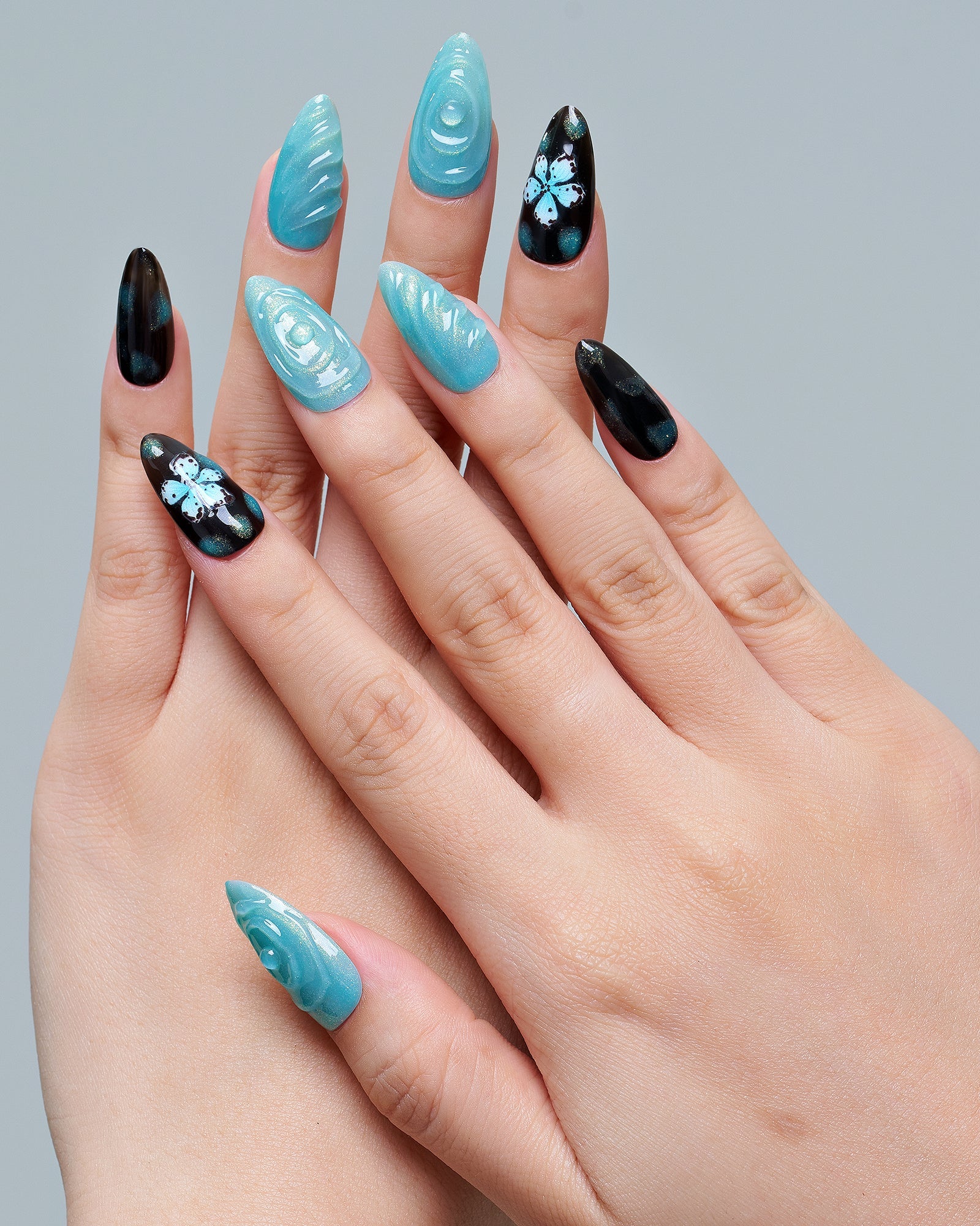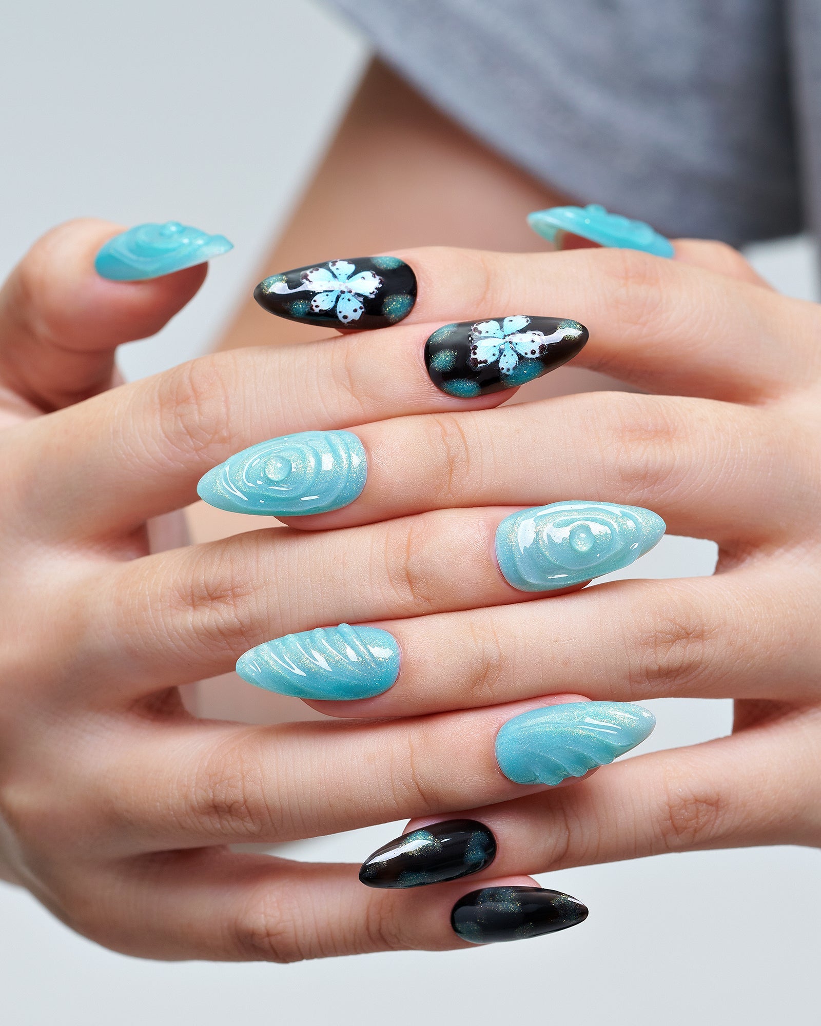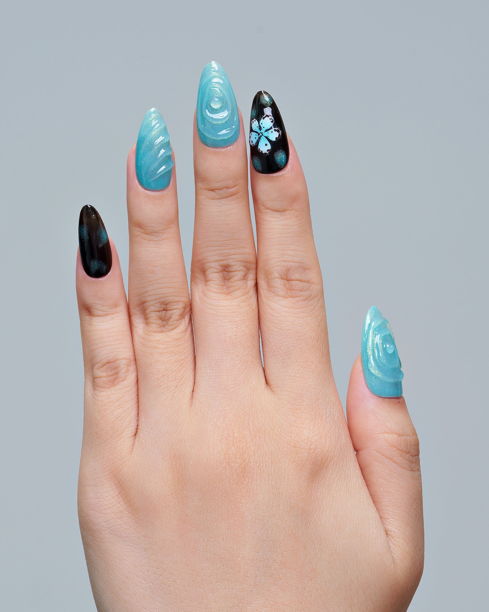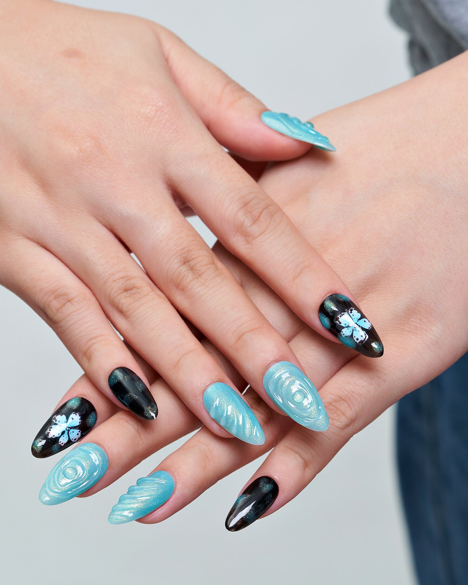 Frosted Petal (Handmade)|manicure|real nail gel|nature|flower|jump color|blue|black|glossy|almond|medium|3d art|daily – Glamermaid Glam