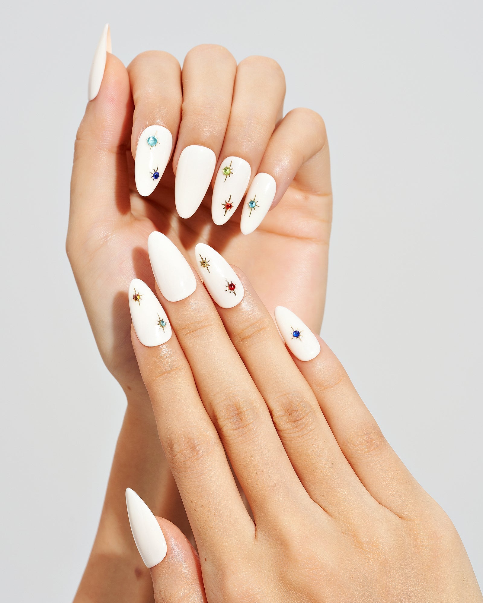 Eternal Shine (Handmade) / Beige|manicure|real nail gel|solid|star|white|glossy|almond|medium|3d art|wedding – Glamermaid Glam