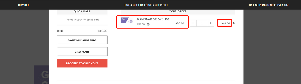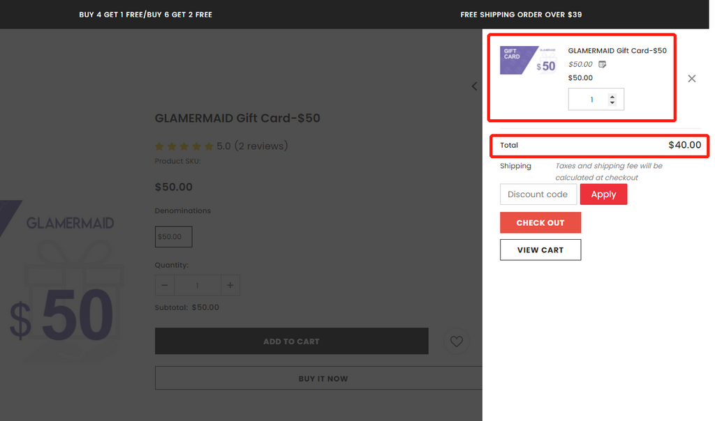 The final payment price of the gift card can be seen in the cart and checkout page is $40.