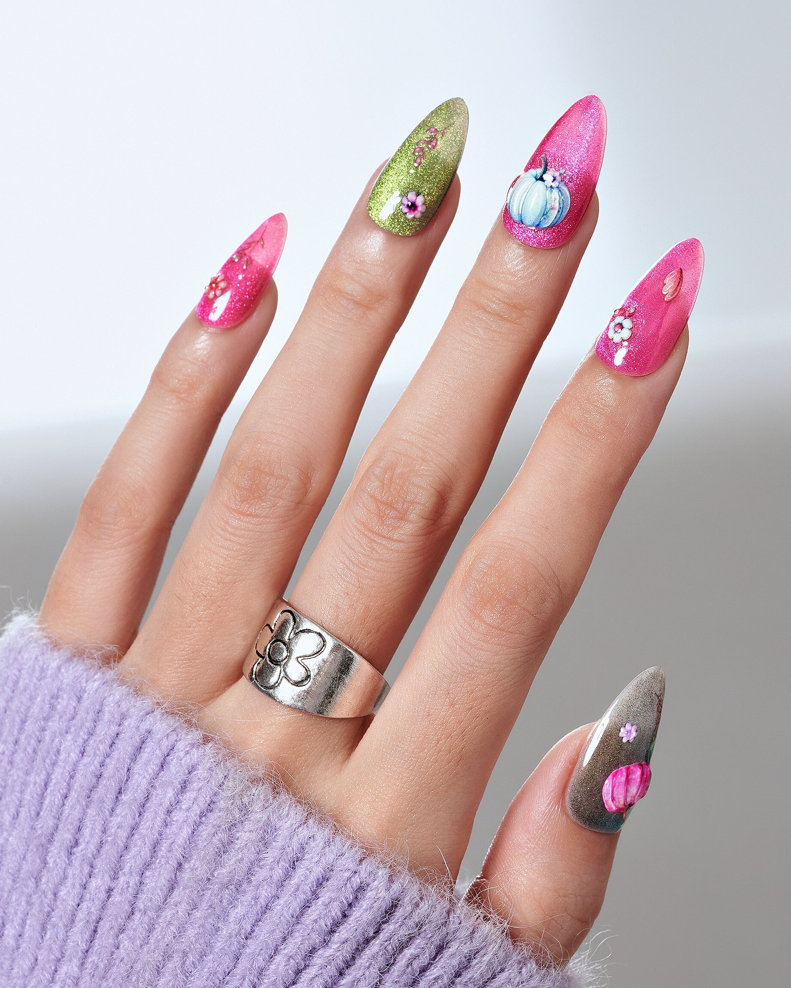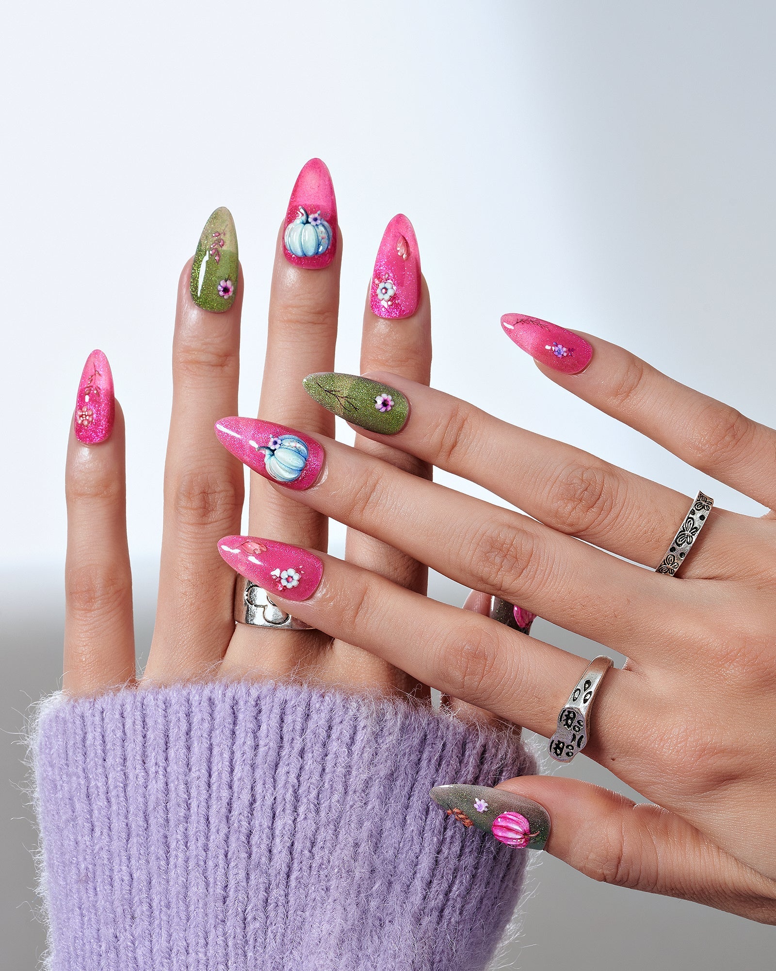 Pumpkin Banquet (Handmade)|manicure|pumpkin|flower|thanksgiving|real nail gel|jump color|green|pink|glossy|almond|medium|3d art|vacation – Glamermaid Glam